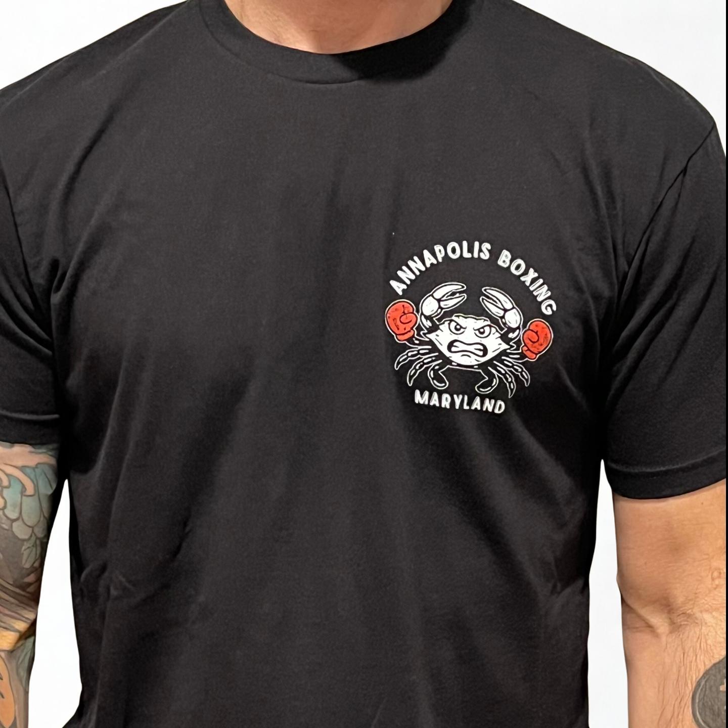 This black Annapolis Boxing tee features our signature angry crab logo — small hit on the chest, full knockout on the back. Soft, breathable, and ready for anything from pad work to post-workout hangs.