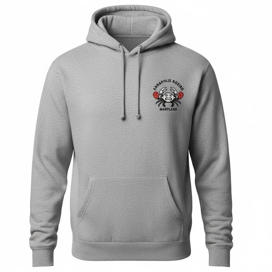 The Heather Grey Heavy Hoodie delivers warmth, comfort, and presence. Made with a heavier fabric for real cold-weather use, it features a clean front chest logo and our iconic Annapolis Boxing crab across the back — strength, resilience, and pride in where we train.